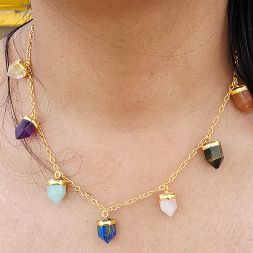 The necklace features a fine gold-tone chain adorned with multiple geometric crystal pendants in deep sapphire blue and soft translucent tones. The unique faceted stones catch the light beautifully, creating a subtle yet eye-catching sparkle.