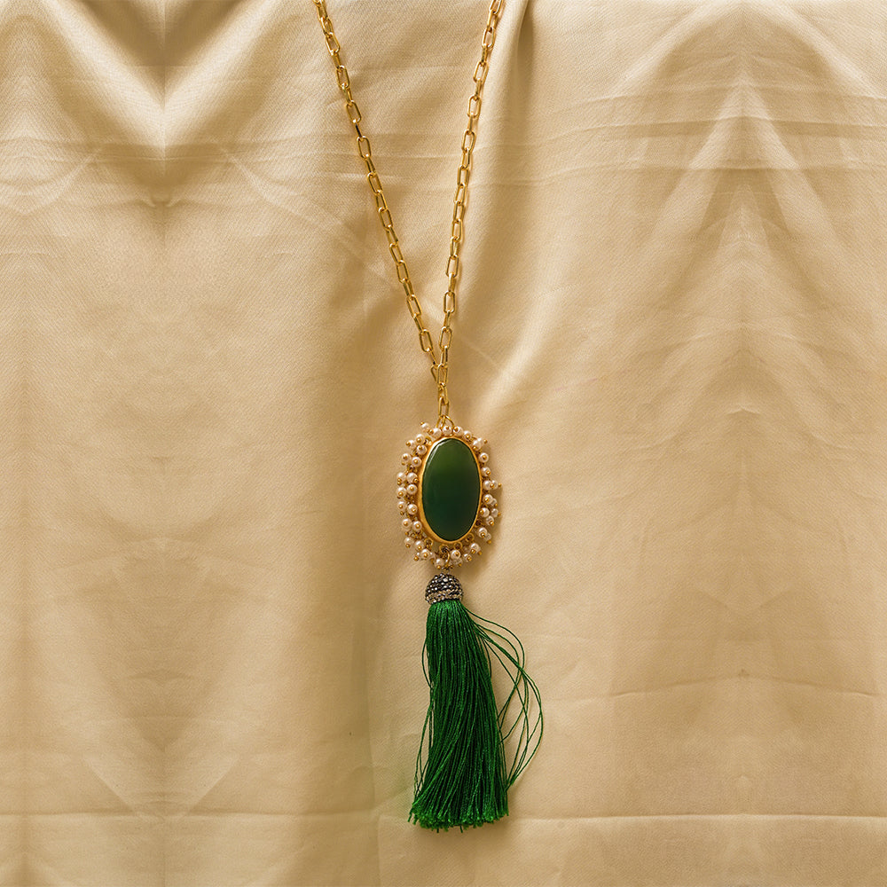 Suspended below, a rich green silk tassel flows gracefully, creating movement and charm with every step. The sleek gold chain completes the design, making it a perfect accessory to elevate both traditional and contemporary outfits.