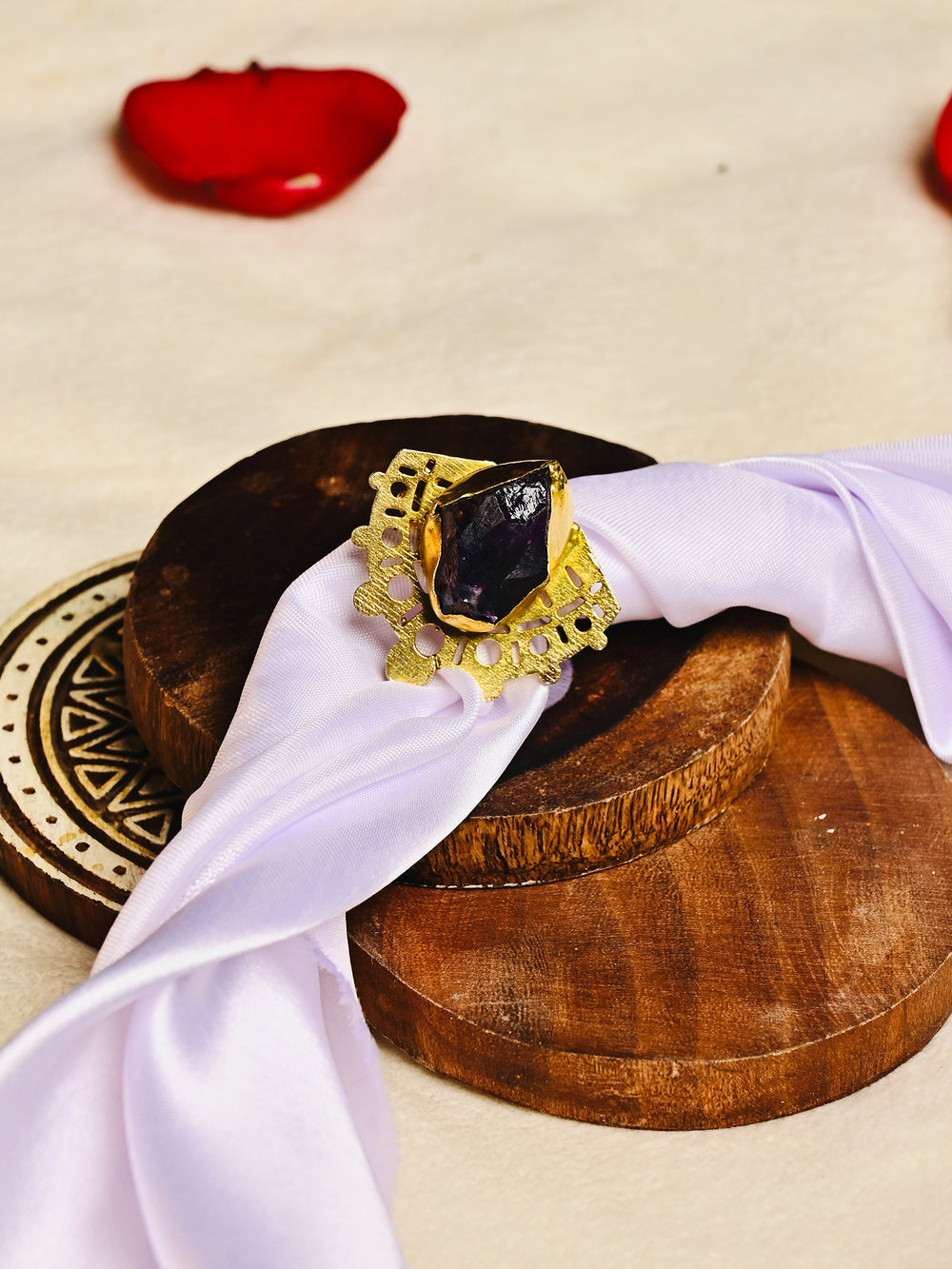 Gold Plated Brass Amethyst Uncut Rough Ring. Featuring a natural raw amethyst stone in its organic form, this handcrafted ring celebrates the beauty of nature with a luxurious gold-plated finish and an intricately designed brass base.